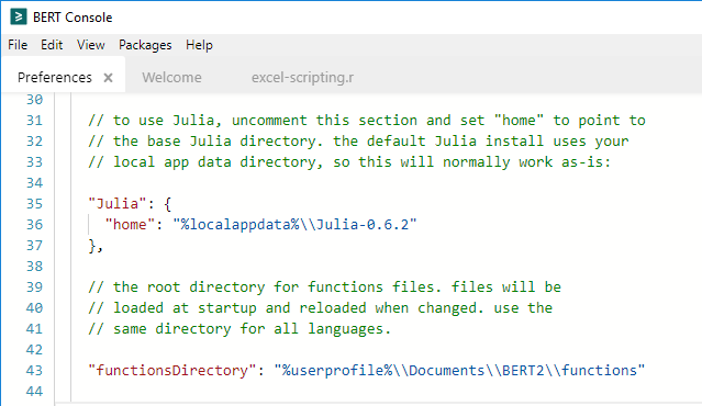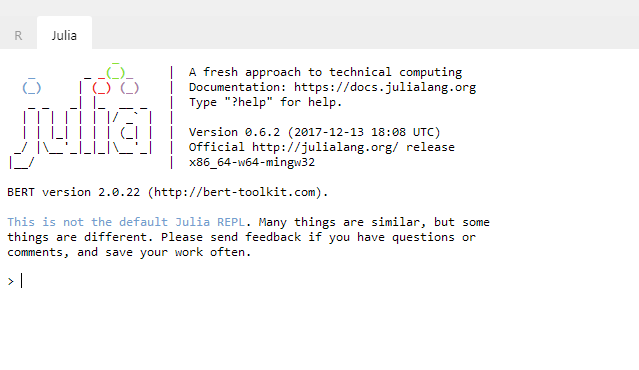 (If you don’t see the Julia tab, double-check your preferences file). The BERT Julia shell is not the default Julia REPL, but it’s similar. Most things that work in the Julia REPL will work.
